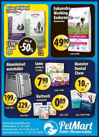 Salon Akvaarioliike on tunnettu, jo 40 vuotta toiminut eläinkauppa Salon keskustassa. Tarjoamme monipuolisen valikoiman ruokia, tarvikkeita ja muita tuotteita, lähes kaikille lemmikeille laadukkailta tuotemerkeiltä. Myymme myös lemmikkieläimiä; jyrsijöitä, akvaariokaloja ja matelijoita. Tule ihmeessä katselemaan ja tekemään ostoksia! Jos haluat kysyä lemmikeistä tai tuotteistamme etukäteen, ota rohkeasti yhteyttä.